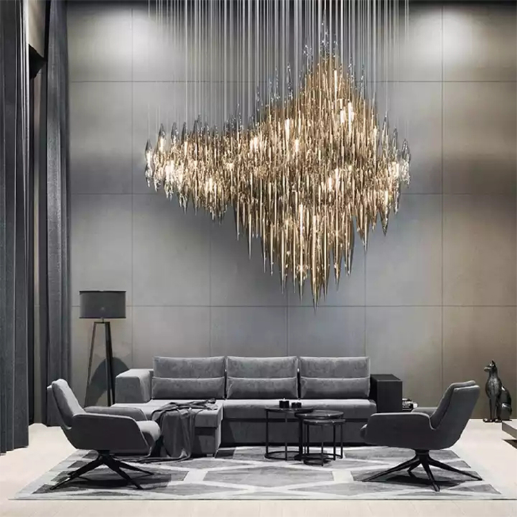 luxury hotel lobby stairwell high ceiling crystal pendant lighting chandelier
